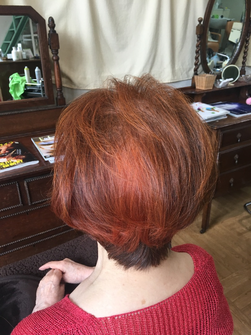 天然100パーセントヘナをされた方です。 ヘナは植物の葉を粉末にしたものなので髪を傷ませないで白髪染めをした方にはお勧めですね。 この方はヘナのナチュラルのみで染めています。白髪の部分はこんな感じのオレンジになります。綺麗ですよね。ただ天然100パーセントヘナだと黒髪の部分はほとんど変わりませんので黒髪に白髪のある方は白髪の部分だけがこのオレンジに染まります。黒髪ともう少しなじませたい時は、インディゴのブルーをブレンドすることでオレンジが少しブラウンなります。もちろんインディゴも天然100パーセントです。ヘナのナチュラルとインディゴのブルーの調合比率や、二度染めのやり方などで出来上がりの色味を変えていきます。もうひとつヘナの使い方として是非試して欲しのがくせ毛で悩んでいる方です。 ヘナをやっていくことでくせ毛の収まりが良くなってきます。どうしてだかなかなか説明は難しいのですが確実に収まりはよくなります。白髪染めだけでなく、もう一つのヘナの使いかたとしてお勧めします。 |