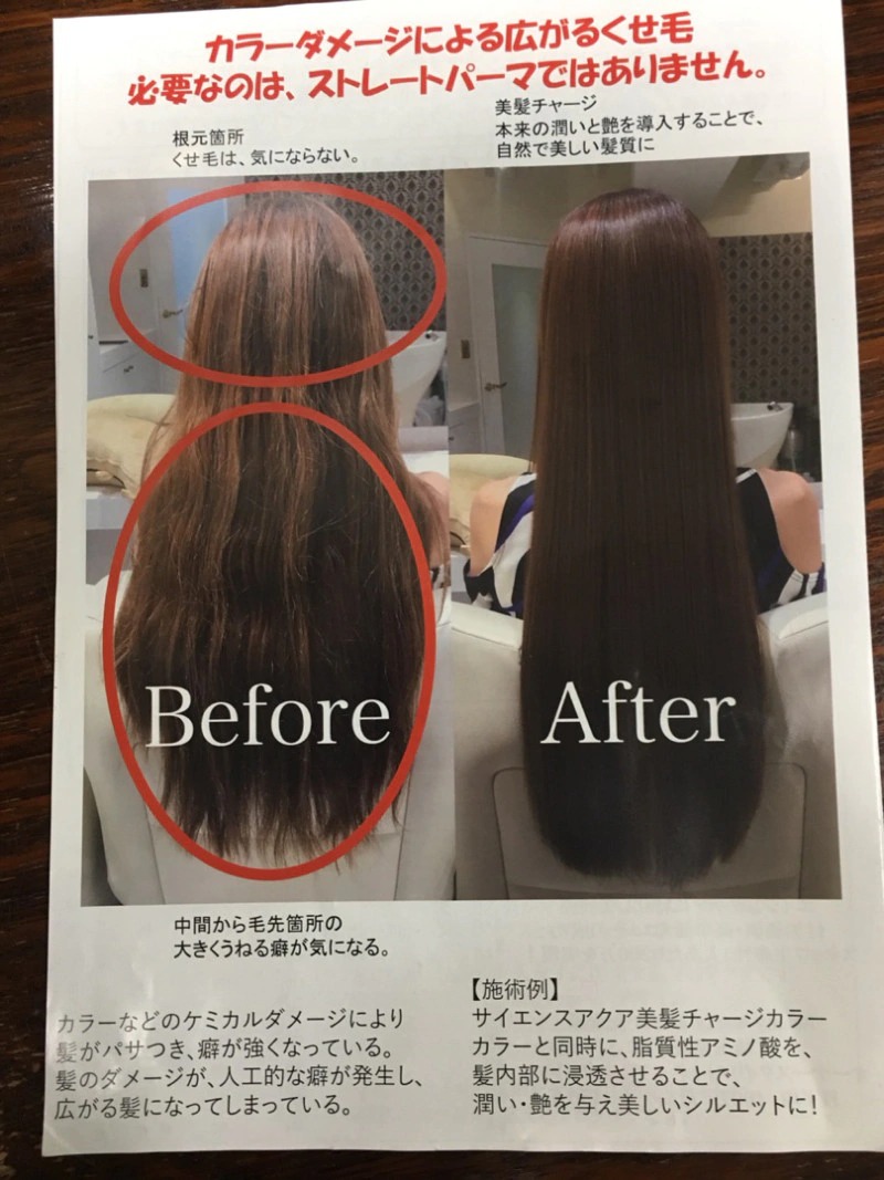 皆さんこんにちは。レキュップの山下です。新しいメニューを導入することにしました。ズバリ髪質改善トリートメントです。例えば矯正ストレートまでは必要ないが微妙な癖毛でパサついたりダメージでスタイリングに苦労されてる方におススメです。サンプルの写真が有るので載せます。 準備が出来次第メニューに載せます。詳しくはまたお知らせします。^ - ^ |