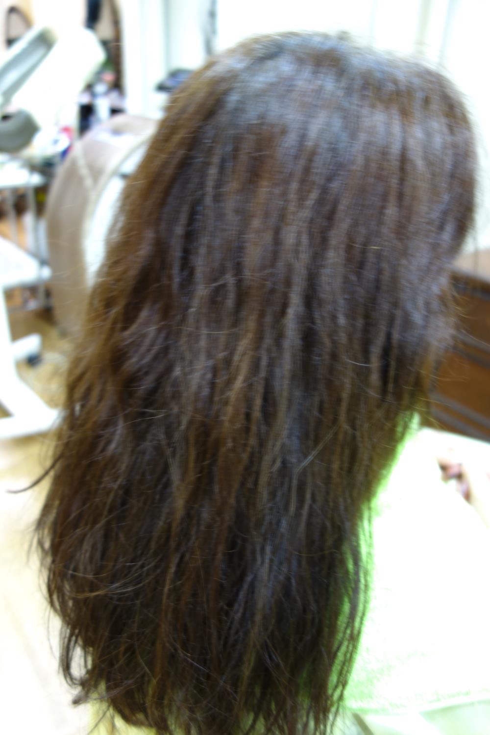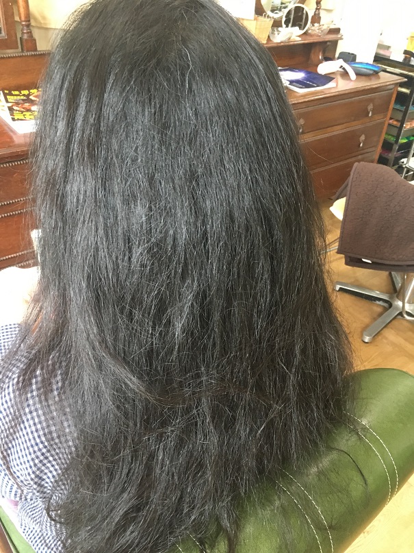 この前髪質改善エステの紹介のときの写真がこちらです。ストレートパーマではなく、エステトリートメントです。一回でなく数回でこのような艶のある髪にして行きます。 |