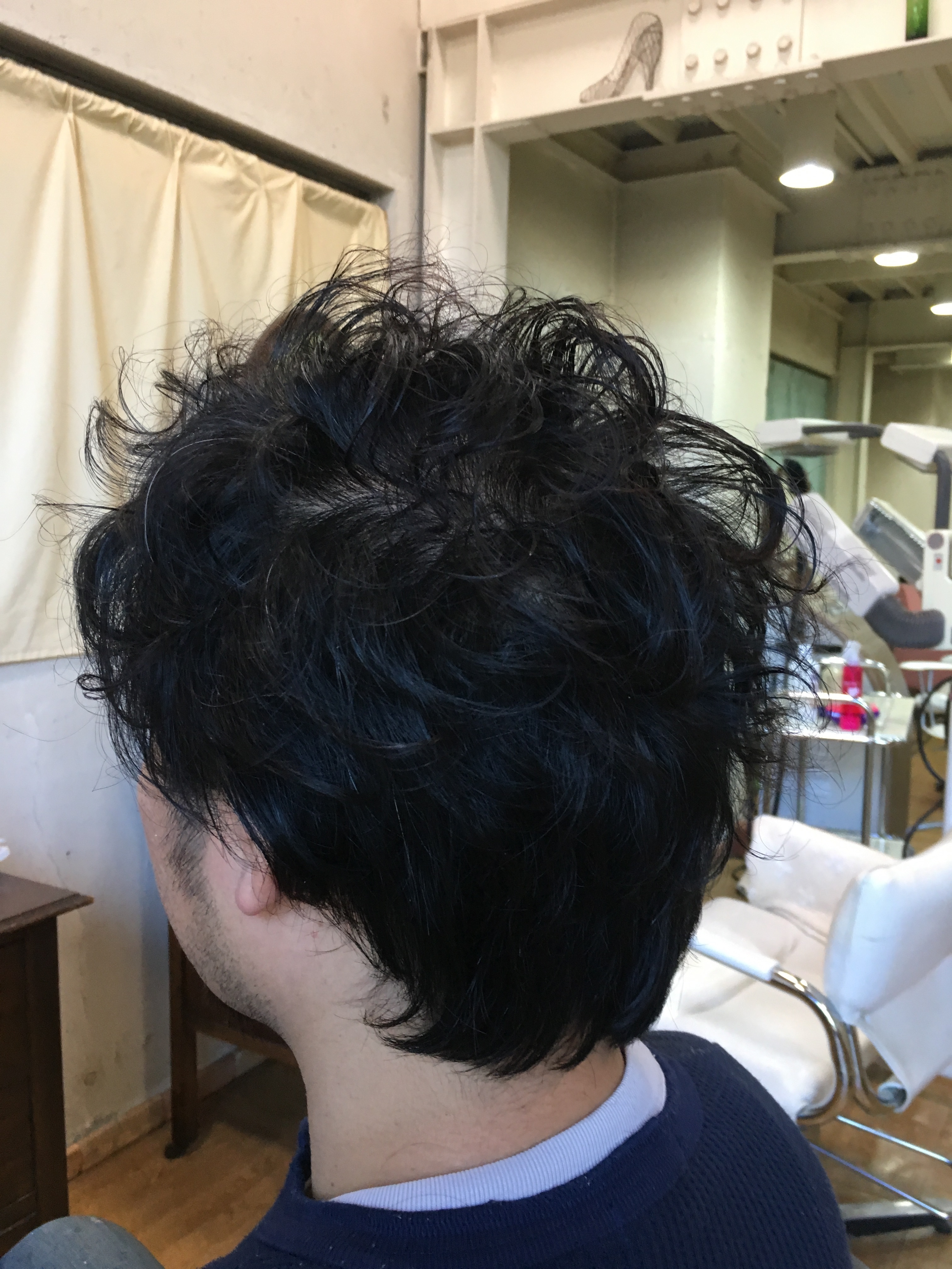 メンズのパーマスタイルです。こちらの方はトップがぺっちゃんこになってしまうのでくるんとしたパーマをかけることでボリュー?をだしています。 |