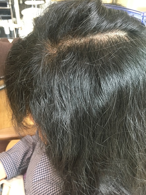 今回は髪のいろいろな悩みについてです。髪の毛の悩みは人それぞれだと思います。例えば、はちがはっていたり、ぜぺきだったり、癖毛の人は、広がっり、うねったり、ゴワゴワぱさぱさでスタイリングが思うよにできなかったり。パーマやカラーのよるダメージ毛であったり。あと年齢によるトップのボリュームダウンやつむじ割れなどその他まだまだいろいろあると思います。さて今回写真の方はどんな悩みがあるのでしょうか。。。。パッと見、 すぐに目に付くのがトップのつむじ割れと、それにより根元の白髪が目立っています。 |
